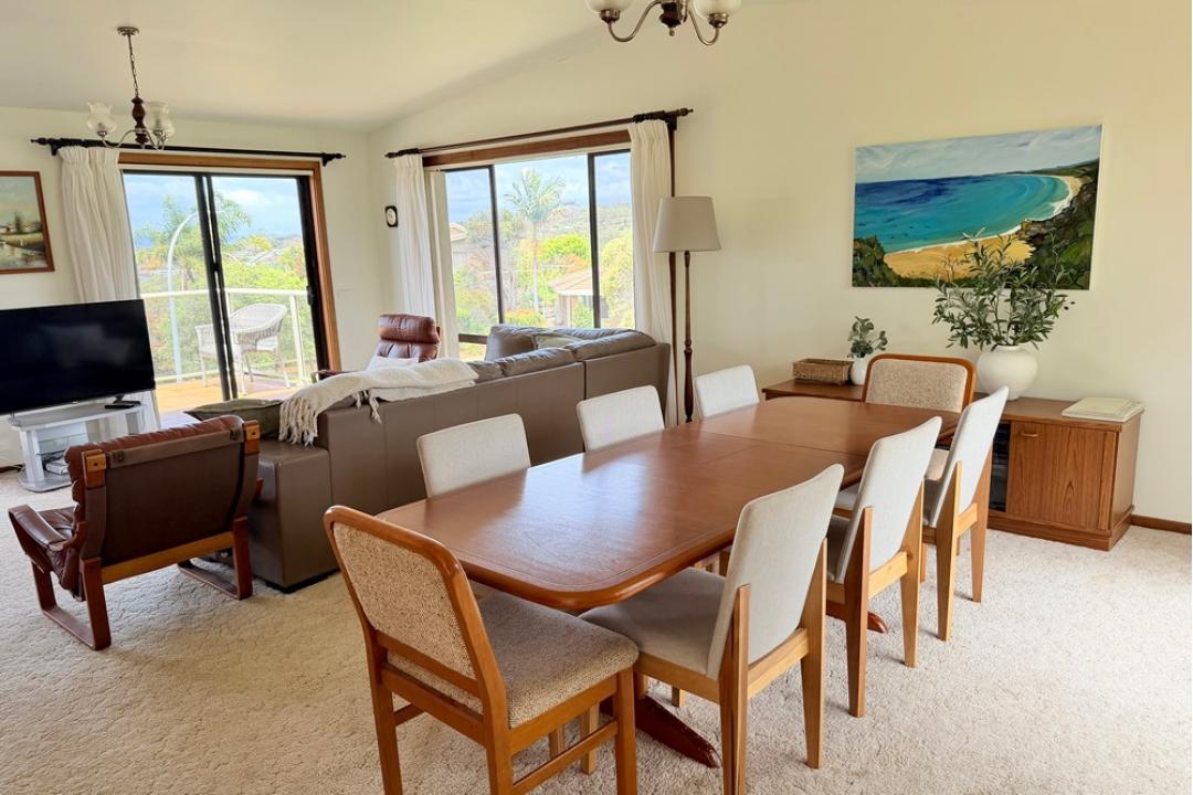 This charming beachside home offers stunning ocean views, a spacious open-plan kitchen and dining area, and a cozy living room perfect for relaxing.